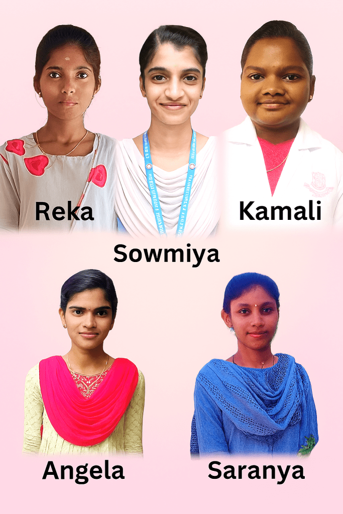 - Dharshini (fysiotherapie): Haalde de zware opleiding aan het Medical College van Coimbatore met uitstekende cijfers. Ze volgt nu een betaalde stage van één jaar die het leven van haar familie ingrijpend zal verbeteren.